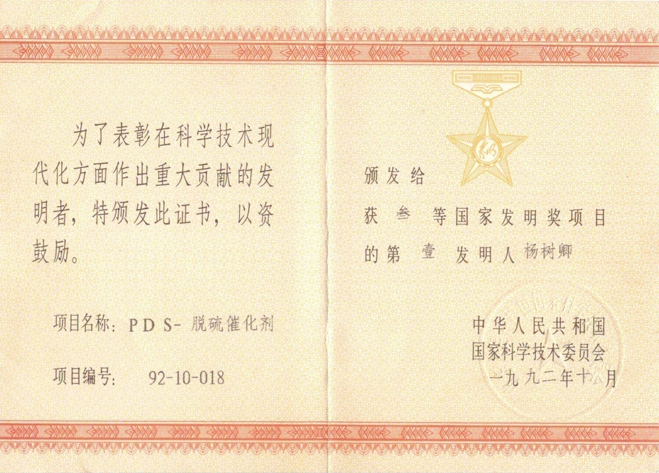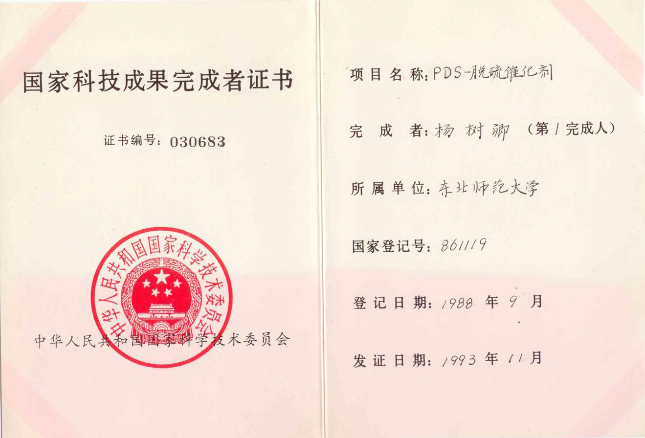 从1976年起,在东北师范大学杨树卿教授与其研究团队通过十余年的艰苦研究与反复试验下,于1985年发明PDS脱硫催化剂,杨树卿教授曾获得以下奖项等: